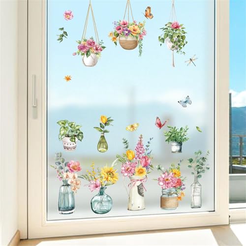 decalmile Fensteraufkleber Blumen Frühling Topfpflanze Fenster Abziehbilder Hängende Pflanzen Blätter Anti-Kollision Fensterfolie Glas Fensterdeko Aufkleber