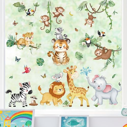 decalmile Fensterbilder Kinderzimmer Fensteraufkleber Waldtiere Fenster Abziehbilder Tiere Affe Löwe Fenstersticker Glas Wiederverwendbar Fensterdeko