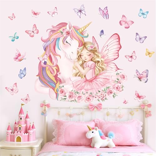 decalmile Wandsticker Einhorn Prinzessin Rosa Wandtattoo Schmetterling Blumen Wandaufkleber Mädchen Kinderzimmer Schlafzimmer Babyzimmer Wanddeko