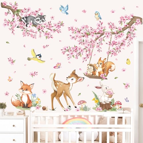 • decalmile Wandsticker Waldtiere Kirschblüte Rosa Baum Groß Wandtattoo Kirschbaum Hirsche Fuchs Wandaufkleber Mädchen Kinderzimme Babyzimmer Schlafzimmer Wanddeko