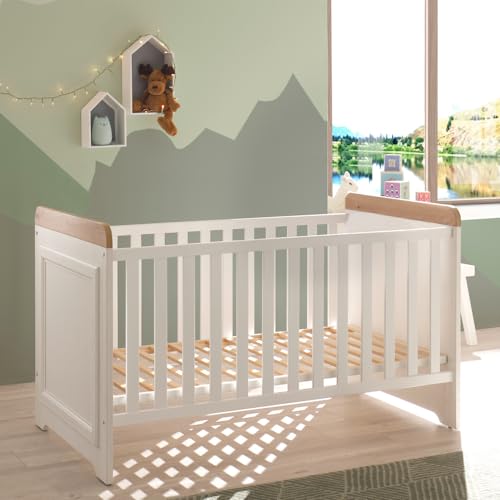 Lomadox Babyzimmer Set 4-teilig, Kleiderschrank, Gitterbett, Standregal, Wickelkommode umbaubar zur Kommode, Landhausstil, Pine weiß mit Eiche