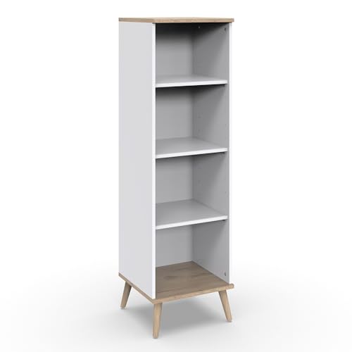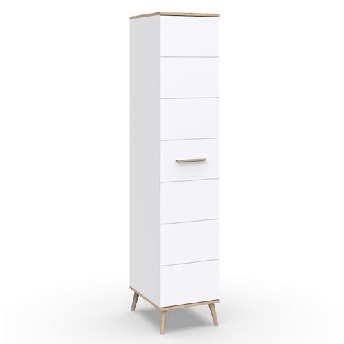 • MATERIAL – Korpus / Front: Qualitätsspanplatte mit Dekorfolie; Farbe / Dekor: weiß, Viking-Oak Nb.; Türen: Softclose-Funktion; Griffe: Holz; Füße: Holz; Beschläge und Scharniere: Metall