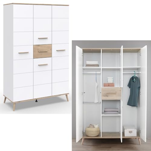 Lomadox Babyzimmer Set Kleiderschrank Babybett Bettschublade Schrank Regal Wickelkommode Wandboard skandi Stil weiß mit Eiche