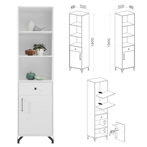 • MATERIAL – Korpus: Qualitätsspanplatte, laminiert, weiß; Front: Qualitätsspanplatte, laminiert, weiß Glanz; Kante: ABS-Kantenschutz; Griffe: Bügelgriffe, Knopfgriffe, Metall, schwarz; Füße: Metall, schwarz; Beschläge und Scharniere: Metall
