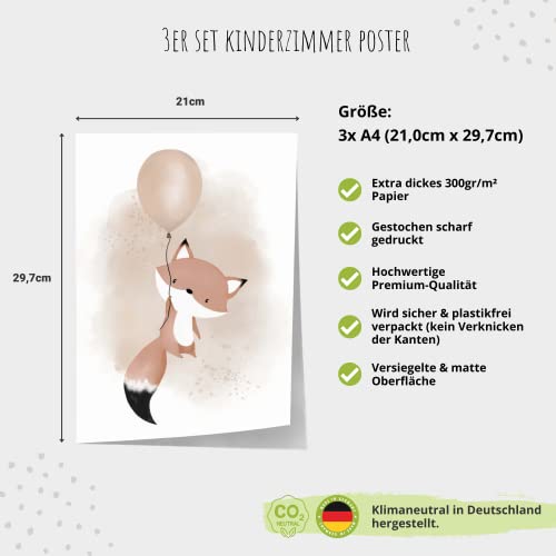 MeinBaby123® I Bilder Kinderzimmer | 3er Set DIN A4 | Wandbilder | Kinderzimmer Poster | Deko Bilder Kinderzimmer Mädchen und Jungen | Babyzimmer Deko (Luftballon & Fuchs beige)