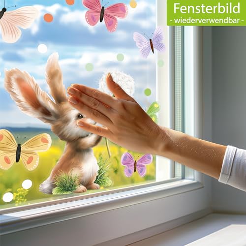 - HÜPFENDER HASE & SCHILLERNDE SCHMETTERLINGE: Ein Fensterbild wie aus einem Kinderbuch, wo ein flauschiger Hase mit großen, weichen Ohren eine Pusteblume umklammert. Bunte Schmetterlinge tanzen umher und bringen das Lächeln eines sonnigen Tages direkt in Ihr Kinderzimmer.