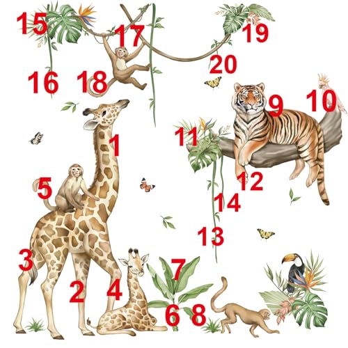 wondever Wandtattoo Dschungel Tiere Baum Zweig Wandaufkleber Safari Giraffe Tiger Affe Wandsticker Wanddeko für Kinderzimmer Jungen Babyzimmer