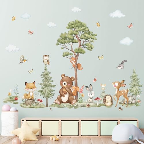 wondever Wandtattoo Waldtiere Baum Groß Kiefer Wandaufkleber Tiere Bär Fuchs Reh Wandsticker Wanddeko für Kinderzimmer Mädchen Babyzimmer